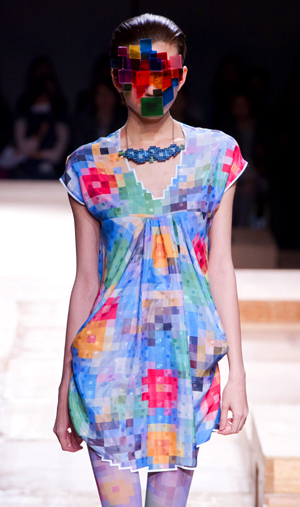 さらに、この模様を使って作られた服を見ると分かるように、実はこの模様を構成している巨大なPIXELの輪郭線は、服の形の輪郭にもなっています。