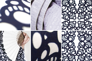 2009年は、ゆかたの基本とも言える白地に紺の色使いと ヒロコレッジ特有の円と直線だけで構成されたパターン。 この2つの掛け合わせから思い描かれるイメージを 軽やかに飛び越えていく、粋で現代的な仕上がり!